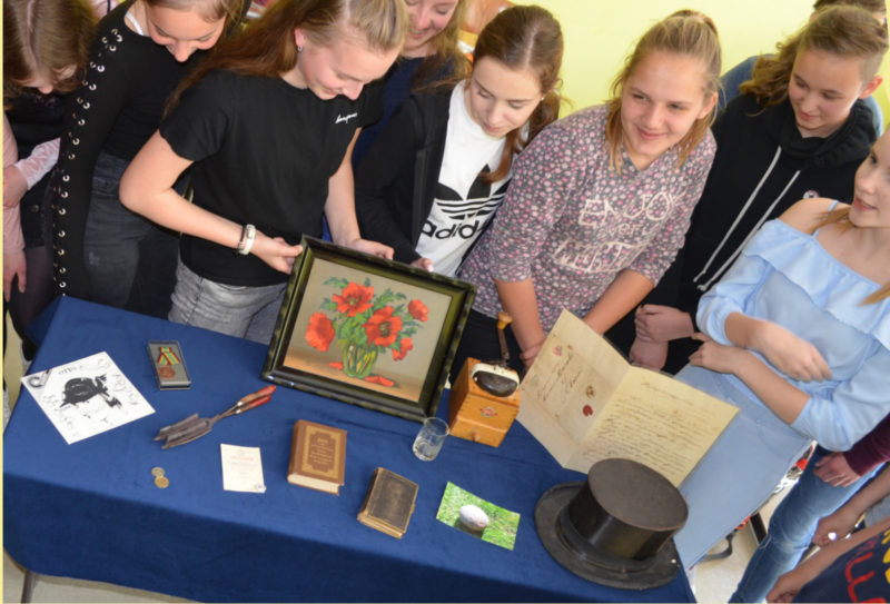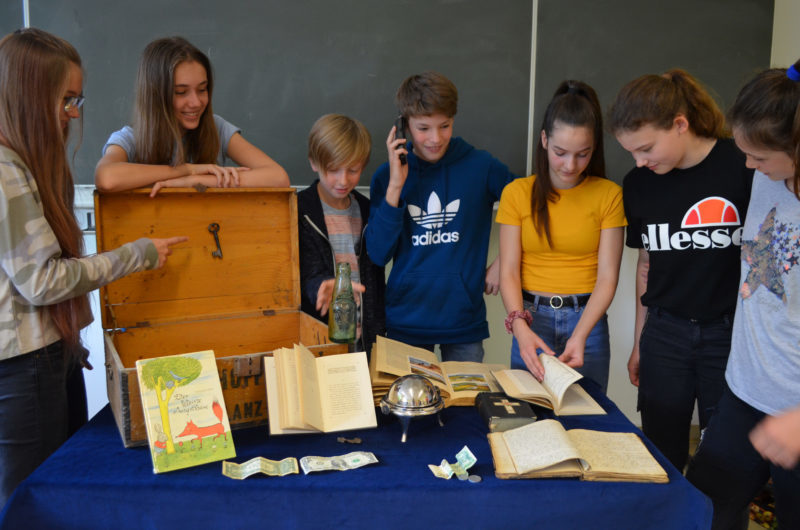 In den letzten Schulwochen vor den Ferien haben die damaligen Klasse 7 a und 7 c Kurzvorträge über alte, fast schon historische Gegenstände im Englischunterricht gehalten. Die Aufgabe bestand darin, einen informativen Text nach Vorlage zu schreiben und diesen, dann zu präsentieren. Unter den Objekten waren zum Beispiel ein altes Telefon, ein Rechenschieber (der mechanische Vorgänger vom Taschenrechner), ein Bombensplitter, ein Lockenstab, ein Zylinder (Hut) und alte Bücher. Die Schülerinnen und Schüler hörten aufmerksam zu und stellten ihre Fragen. Manche Dinge wurden danach noch herumgereicht und aufmerksam untersucht. Es lässt sich sagen, dass die Menschen früher schon interessante Dinge hatten, und dass manche davon noch heute genutzt werden. Die Beiträge wurden so gestaltet, dass sie auf dem Pinbrett im Raum von Frau Herrmann ausgehängt werden konnten. Die Schüler lernten den Umgang mit Bildbearbeitungsprogrammen, indem sie nun Fotos und Bilder eingebettet haben.