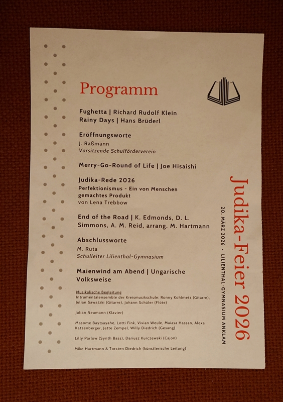 Judikarede 2026 Judikarede 2026Veranstaltung • 21.03.2026 Text folgt Fotos: Frau Herrmann und Dariusz Kurczewski (7a, 12, 14) Von Frau Herrmann|2026-03-21T12:40:26+01:0021. März 2026|Judikafeier| Teile diesen Beitrag! FacebookXTumblrPinterestE-Mail Ähnliche Beiträge Judika 2025 Vorfreude auf die Judikafeier 2025 Judika Rede 2024 Judika 2023 Die 29. Judikarede 2021 von Charlotte Beermann