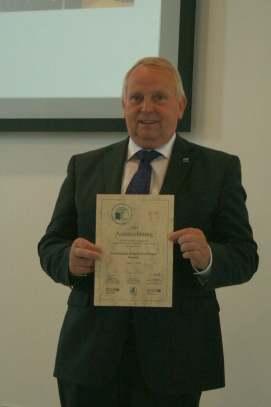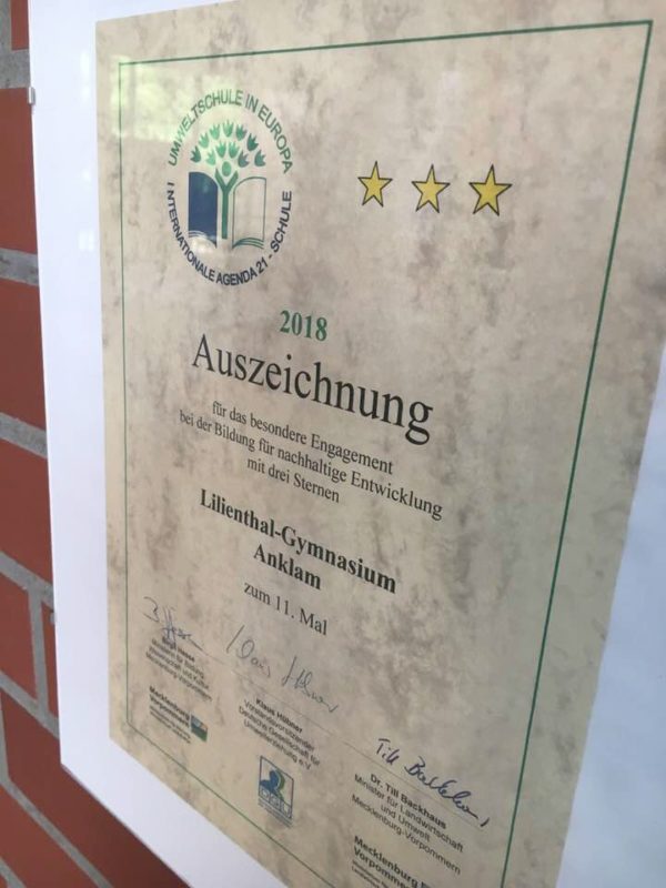 Unsere Schule hat zum elften Mal ihren Titel ,,Umweltschule in Europa / Internationale Agenda 21-Schule“ MV verteidigt und nahm am Donnerstag, den 14.06.2018 im Ozeaneum Stralsund die Auszeichnung von Frau Annegret Gülker (Geschäftsführerin, Deutsche Gesellschaft für Umwelterziehung e.V.) und Herr Minister Dr. Till Backhaus (Minister für Landwirtschaft und Umwelt M-V) entgegen. Diesen Titel wird an Schulen verliehen, die sich im Laufe eines Projektzeitraumes erfolgreich für die Bildung einer nachhaltigen Entwicklung eingesetzt haben. Besonders stolz ist die Fachschaft Biologie darauf, dass sie erneut 3 Sterne gewannen, die höchste Punktzahl in der Wertung.